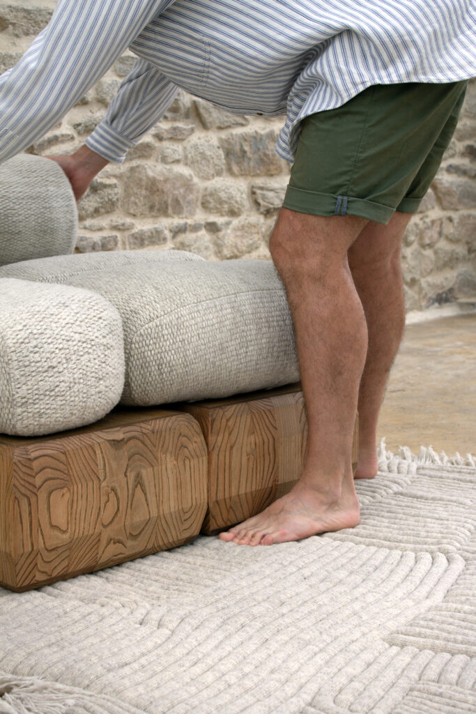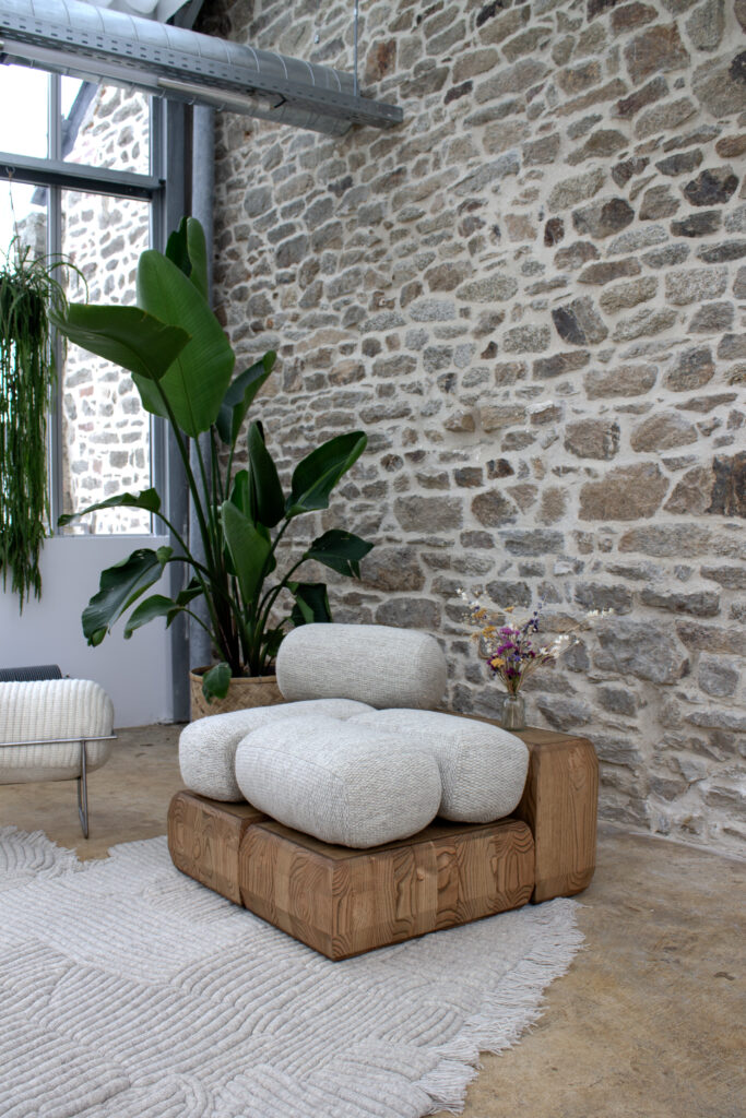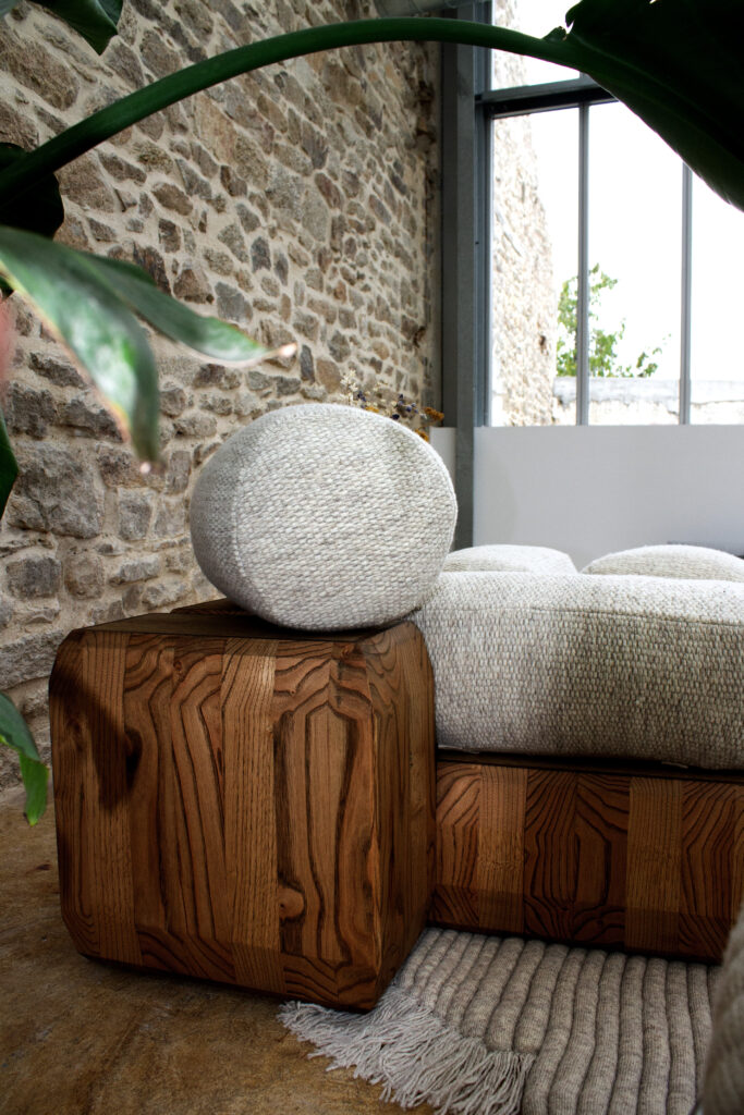 Ce meuble est né des recherches initiales menées au Centre International d’Art et du Paysage de Vassivière. Inspiré par les murs en pierres sèches, je propose un pouf avec une structure en bois et des coussins en laine. Ce meuble peut être imaginé comme un canapé avec ou sans dossier. Il est possible de choisir la couleur du bois et le tissu des coussins. Ces derniers sont scellés entre-eux. Le revêtement est un textile que j’ai conçu et fabriqué au sein de mon atelier. La structure, en bois massif de châtaignier, a été réalisée par l’entreprise Ébénisterie Parallèle située à Crach’.
